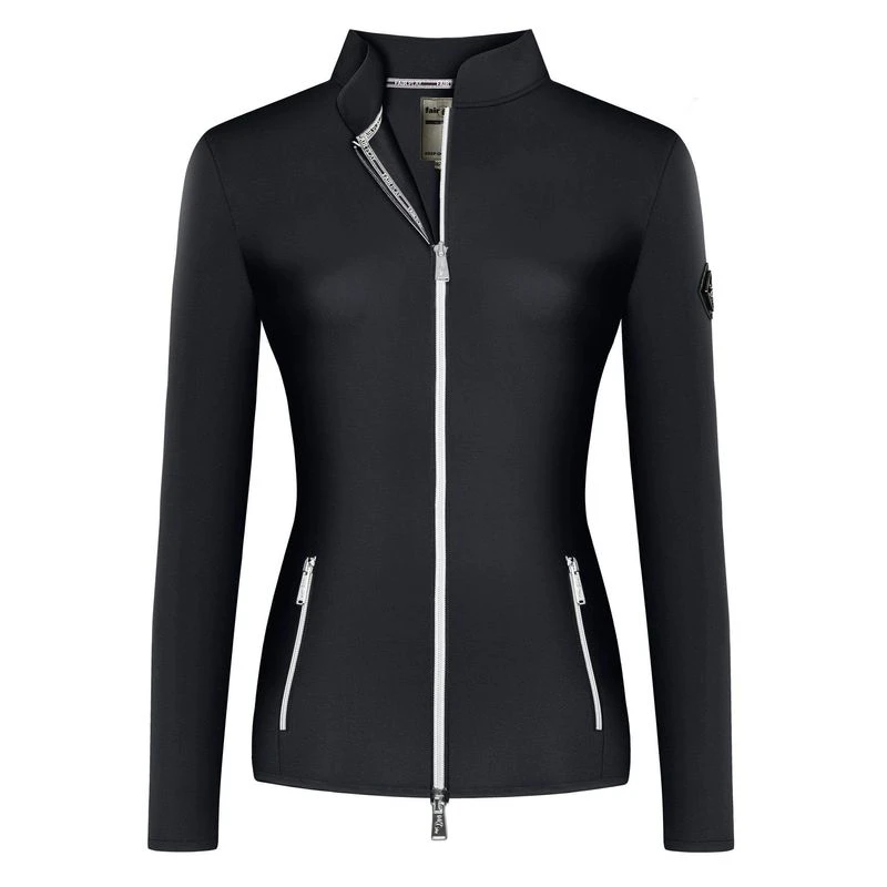 This two way stretch light jacket has a stand up collar and traditional track suit look. It has a feminine, close fitting shape and two way zipper for ease in the saddle. There are two spacious zip pockets and a metal Fair Play logo on the sleeve.