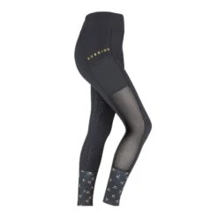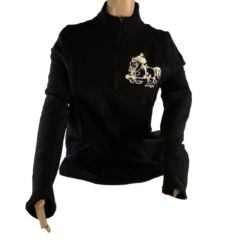 The breathable, quick-drying Horze Sagira Training Shirt is designed in a classic fit. The back is made from golden glitter fabric that adds stunning detail. Lightweight material is great for training. The gold zipper opening provides extra ventilation. Pair this shirt with the Horze Sagira riding tights for a complete outfit.