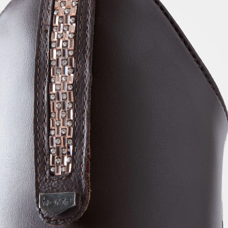 Our Verona Tall Field Boots are both elegant and practical. Just perfect for competitions where you need to look and perform your best. Both detachable trims feature a small, silver pin with the Horze logo. Smooth leather on the outer leg, and an embossed area of leather on the inner leg combine to create highly professional tall boots. The elastic panel that runs the length of the boot shaft ensures a glove-like fit. The foot has punched details, fixed elastic laces and a handy spur rest. A leather strap with snap buttons at the top and bottom of the zipper keeps this boot securely fastened.